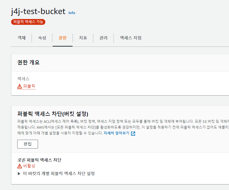 저는 직접 S3에 접근할 수 있는 URL을 입력하여 이미지가 정상적으로 업로드될 수 있도록 하기 위해 퍼블릭 액세스 차단을 모두 해제해주었습니다.