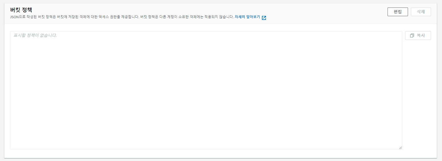 그리고 중간까지 스크롤을 해주시면 버킷 정책을 확인할 수 있는데 여기서 편집 버튼을 클릭합니다.