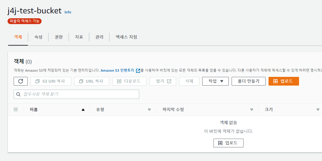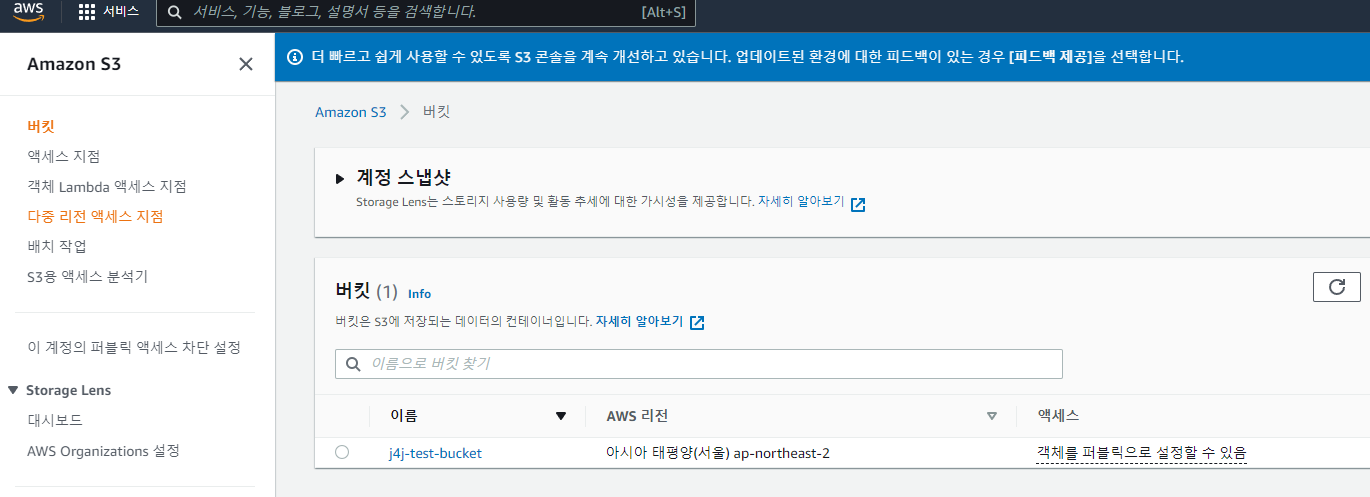 버킷을 만들었다면 다음과 같이 리스트에서 확인이 가능합니다.