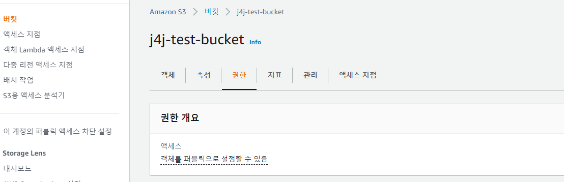 버킷 정책 설정을 위해 만들어진 버킷의 이름을 클릭하고 권한 탭을 선택해줍니다.