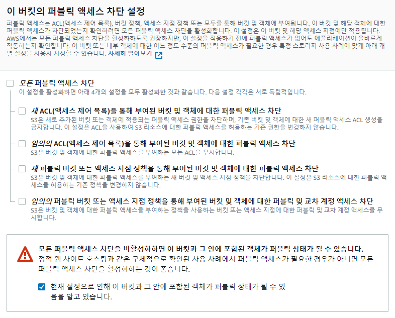 여기서는 퍼블릭 액세스 차단을 위한 체크박스를 선택해주면 됩니다.