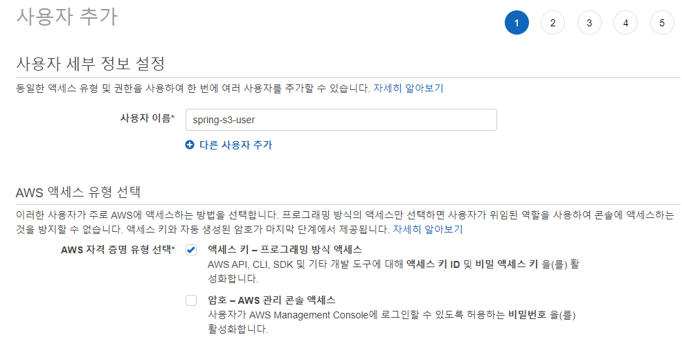 액세스 유형 같은 경우는 액세스 키를 활용하기 때문에 암호 말고 액세스 키를 선택해줍니다.