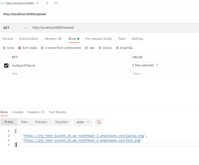 다음과 같이 관련 정보들을 입력해주고 Send를 클릭하면 Response값에 다음과 같이 업로드된 이미지 URL을 확인할 수 있습니다.
