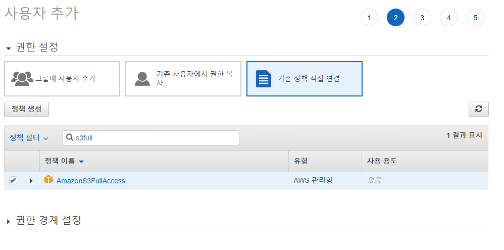 권한은 AmazoneS3FullAccess를 부여하면 됩니다.