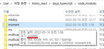 실제로 Dayjs와 Momentjs를 각각 설치해봤을 때 설치된 모듈들의 크기만 비교해봐도 상당히 많은 차이가 보인다는 것을 확인할 수 있었습니다.