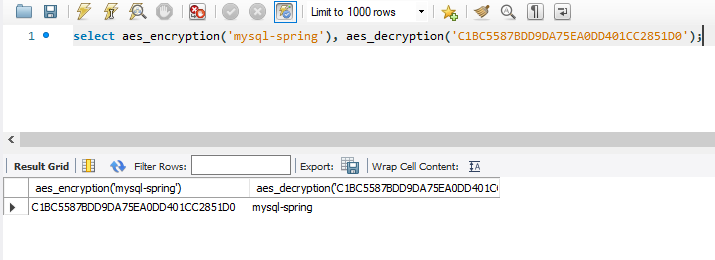 실행한 결과는 다음과 같이 나왔고 MySQL과 동일한 AES 암호화를 하는 것을 확인할 수 있습니다.