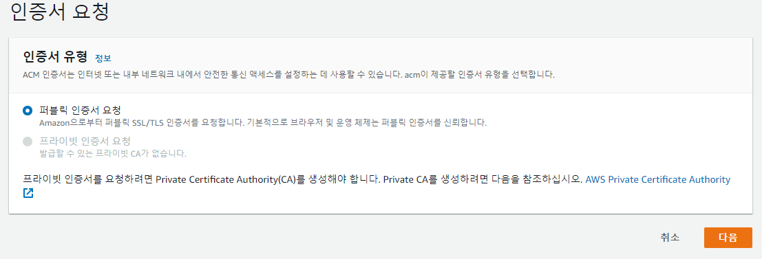 퍼블릭 인증서 요청을 선택한 뒤 다음을 눌러주시면 됩니다.