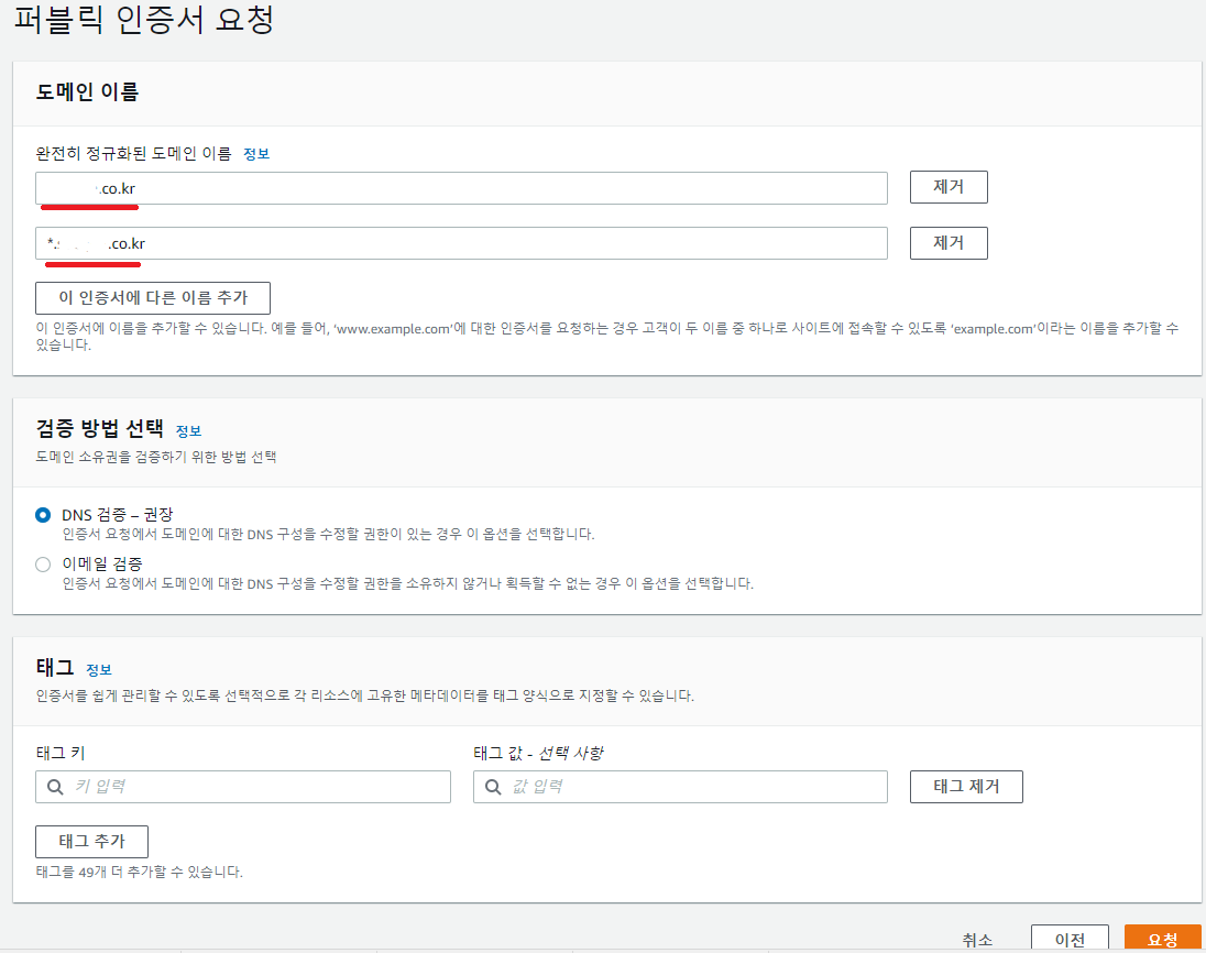 검증 방법은 DNS 검증을 선택해주시고, 모든 정보 입력이 끝났다면 요청 버튼을 클릭하면 됩니다.