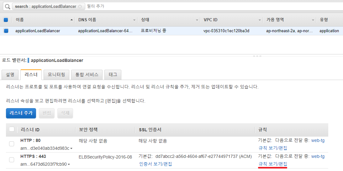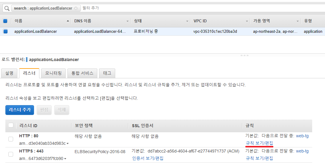 그리고 생성한 로드 밸런서를 선택한 뒤 리스너 탭에서 80 포트에 규칙 보기/편집을 클릭해줍니다.