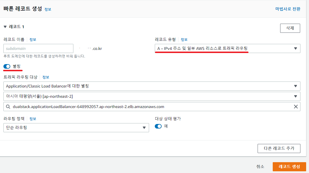 레코드 유형은 A, 별칭을 사용하도록 설정한 뒤 다음과 같이 지금까지 설정해온 ALB를 등록해주면 됩니다.