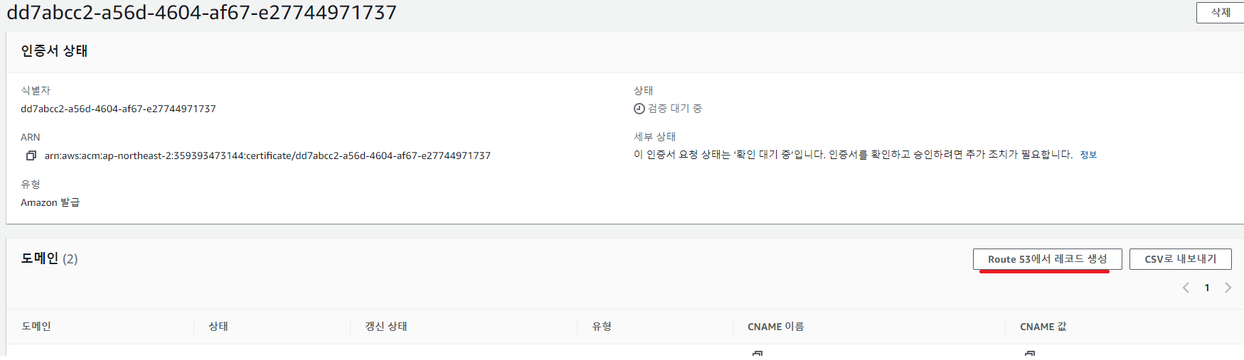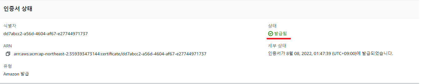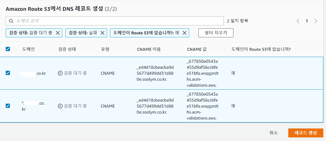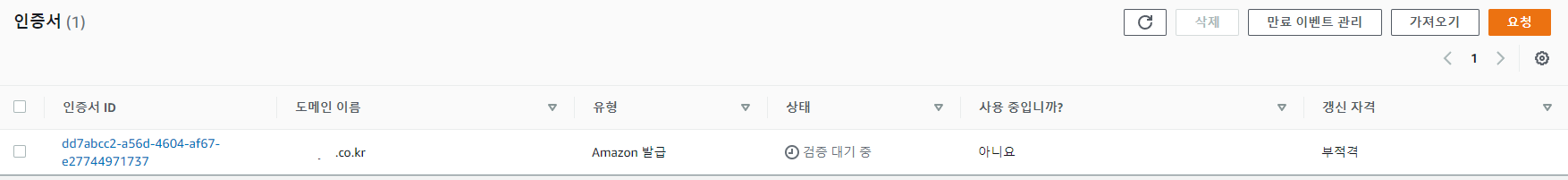레코드 생성을 마친 뒤 저 같은 경우는 5분정도의 시간이 지나니 다음과 같이 인증서 상태가 변경되었습니다.