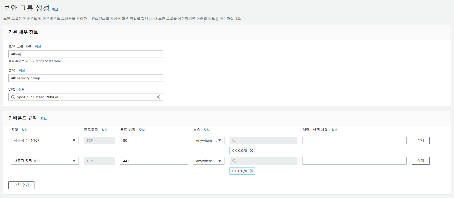 저는 80, 443포트가 ALB에 접근할 수 있어야 하기 때문에 아래와 같이 보안 그룹을 생성해줬습니다.