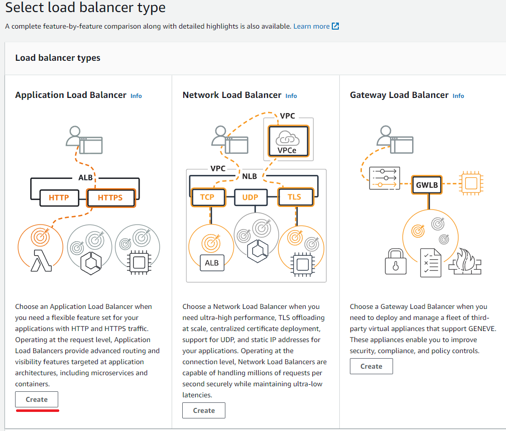 ALB만 있는것이 아니라는 것만 참고해주시고, ALB의 Create 버튼을 클릭해주시면 됩니다.