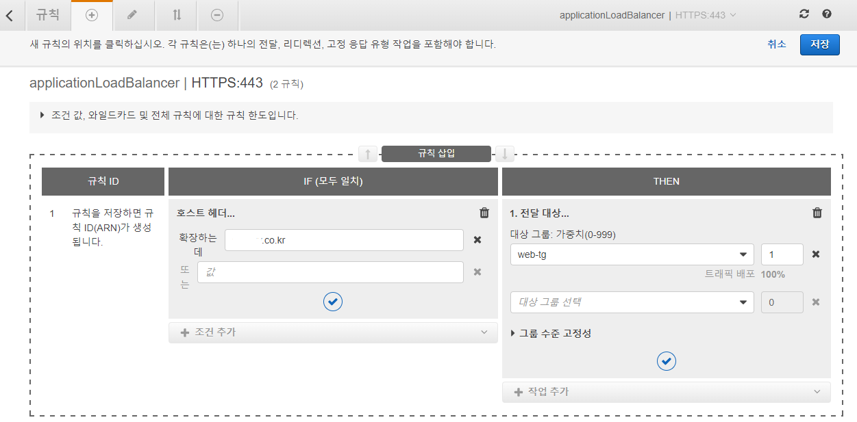 저는 기본 도메인으로 요청이 넘어올 경우 web target group에 설정해둔 값으로 전달받도록 다음과 같이 설정하겠습니다.