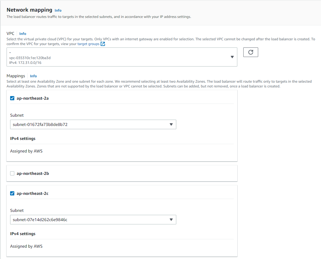 네트워크 매핑은 위에서 확인했던 EC2의 가용 영역을 포함시켜서 최소 2개를 선택해주시면 됩니다.