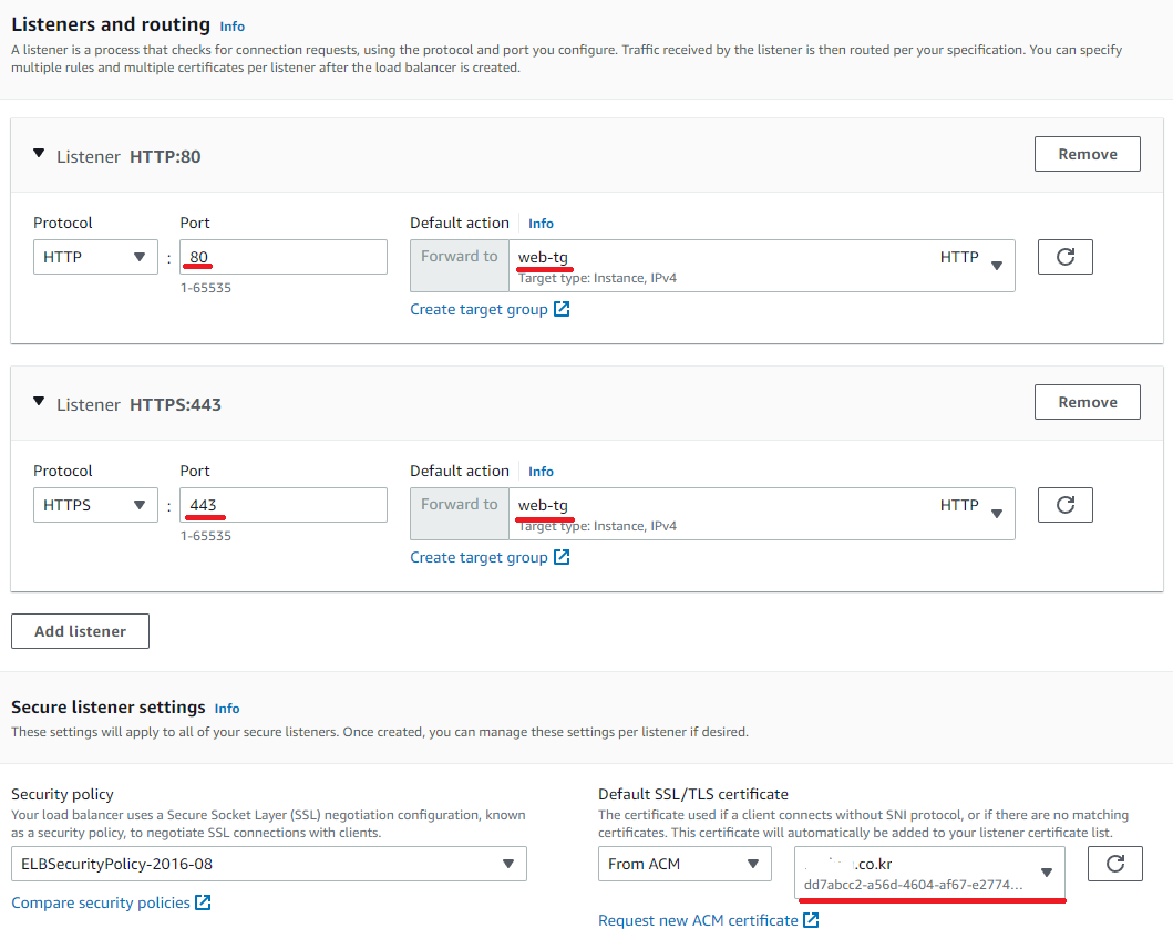 모든 target group 생성이 완료되었다면 리스너 하나를 더 추가해서 443 포트도 등록을 해주고 80과 443 둘 다 default값으로 web target group을 선택해줍니다. (필수는 아닙니다.)