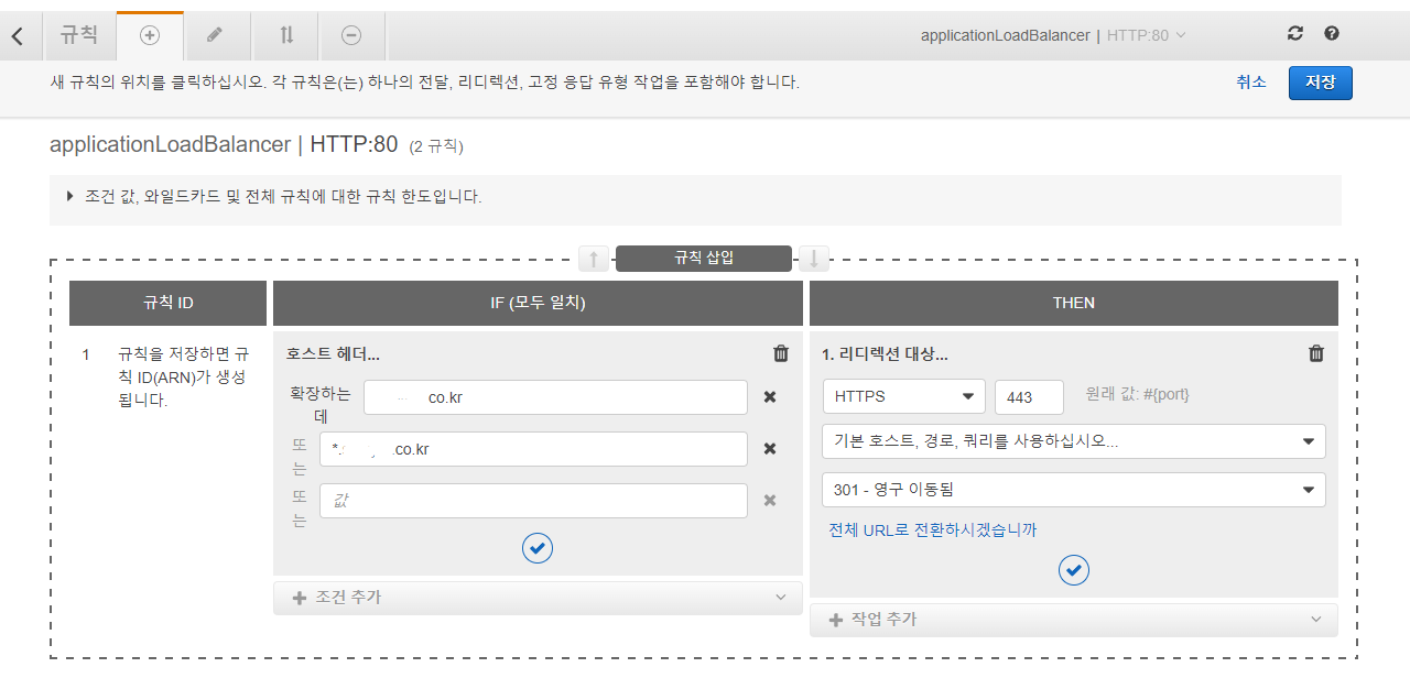 클릭한 뒤에는 아래와 같이 도메인을 호스트로 하여 해당 호스트는 443 포트로 리디렉트 되도록 규칙을 추가해줍니다.