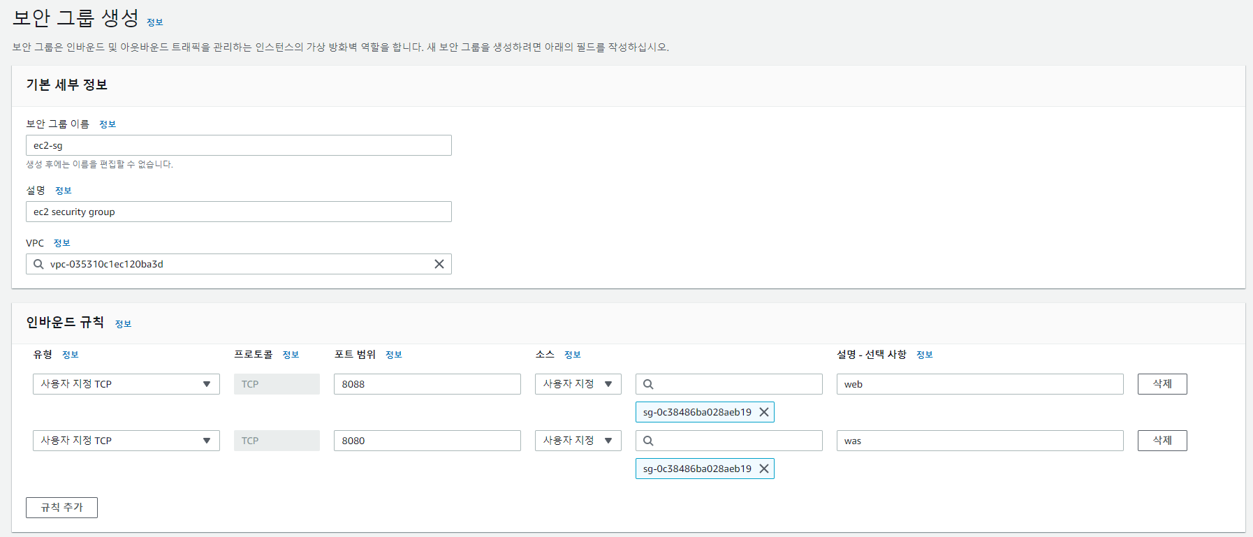 마지막으로 EC2 보안그룹을 생성하도록 하겠습니다.