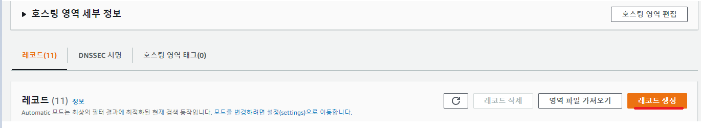 Route 53에서 도메인을 선택한 뒤 레코드 생성 버튼을 클릭해줍니다.