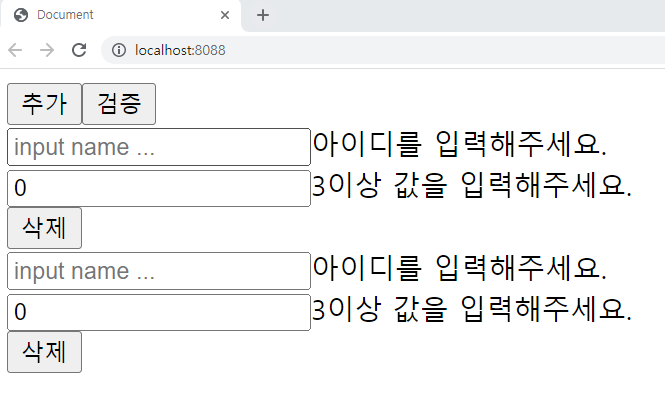 추가를 누를 때마다 이름과 나이를 입력하는 input폼이 같이 생성이 되었고, 검증을 누를 경우 현재 배열의 모든 값에 대해 유효성 검증을 해주고 있었습니다.