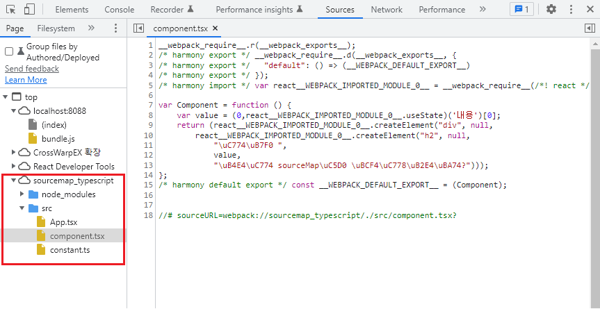 sourceMap은 다음과 같이 개발자 도구에서 확인할 수 있습니다.
