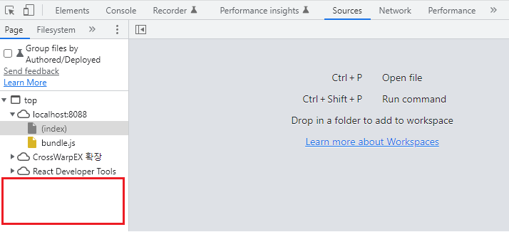 개발자 도구에서 Sources탭에 들어가면 아래와 같이 현재 번들링이 이루어진 항목들에 대한 파일들을 볼 수 있습니다.
