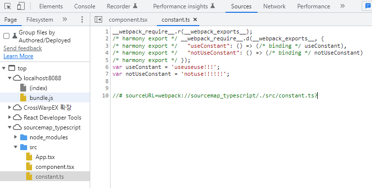 해당 파일에서 useConstant값만 실제 파일에서 가져와 사용하고 있는데 sourceMap에서 다음과 같이 사용되지 않는 notUseConstant 도 확인이 가능합니다.