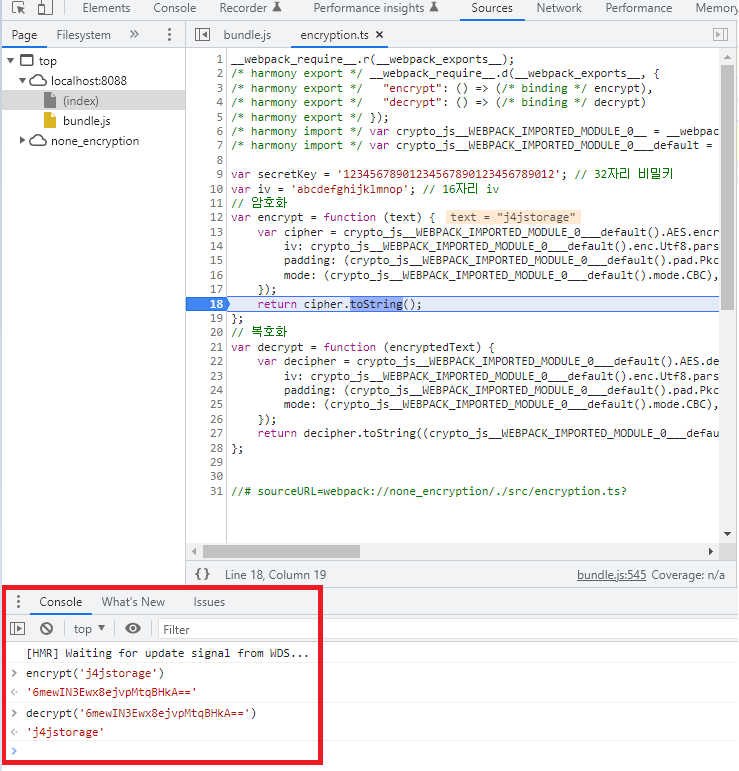 이번엔 암호화 함수를 브라우저에서 실행하여 암호화와 복호화 결과물을 확인해보겠습니다.