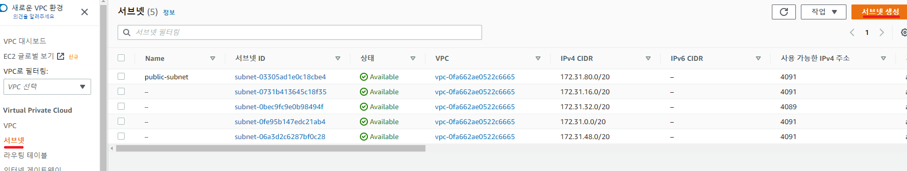 좌측 메뉴에서 서브넷을 선택한 뒤 우측에 서브넷 생성 버튼을 클릭해줍니다.