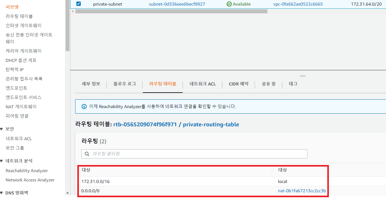 - Private Subnet에서 NAT Gateway를 바라보도록 라우팅 테이블 설정