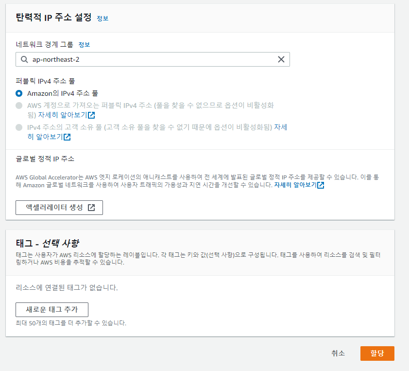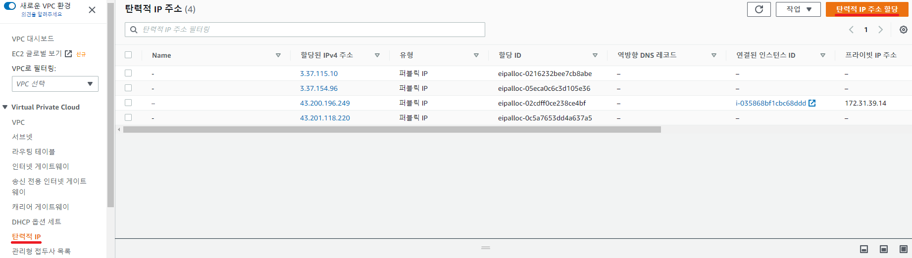 좌측 메뉴에서 탄력적 IP를 선택한 뒤 우측에 있는 탄력적 IP 주소 할당 버튼을 클릭해줍니다.