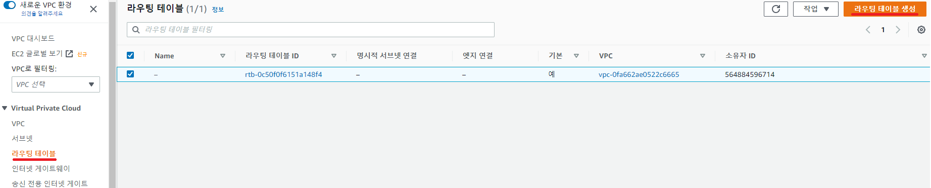 좌측 메뉴에 있는 라우팅 테이블을 선택한 뒤 우측에 있는 라우팅 테이블 생성 버튼을 클릭해줍니다.