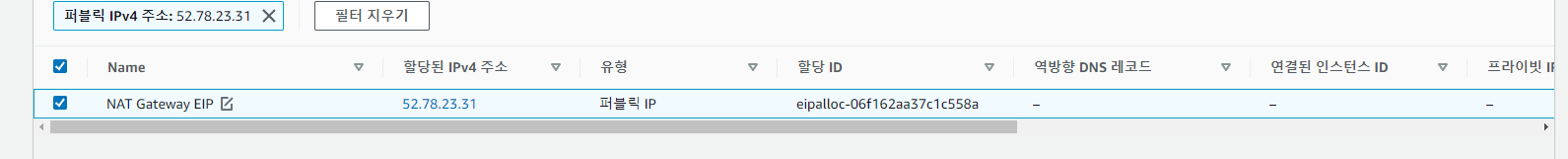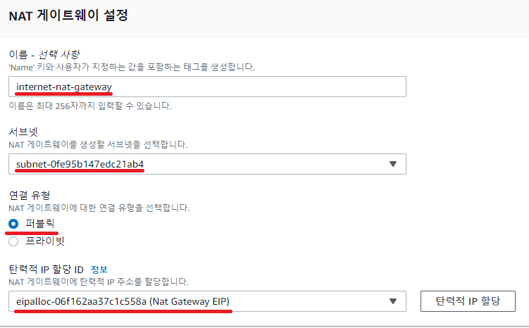 그리고 연결 유형은 퍼블릭, IP 할당은 위에서 만든 EIP를 선택해줍니다.