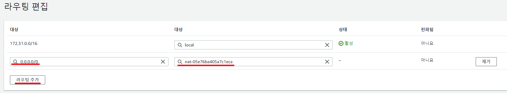 그리고 라우팅 추가 버튼을 클릭하여 대상 정보에서 CIDR을 입력하고 NAT 게이트웨이를 선택하여 위에서 만든 NAT 게이트웨이를 리스트에 골라주시면 됩니다.