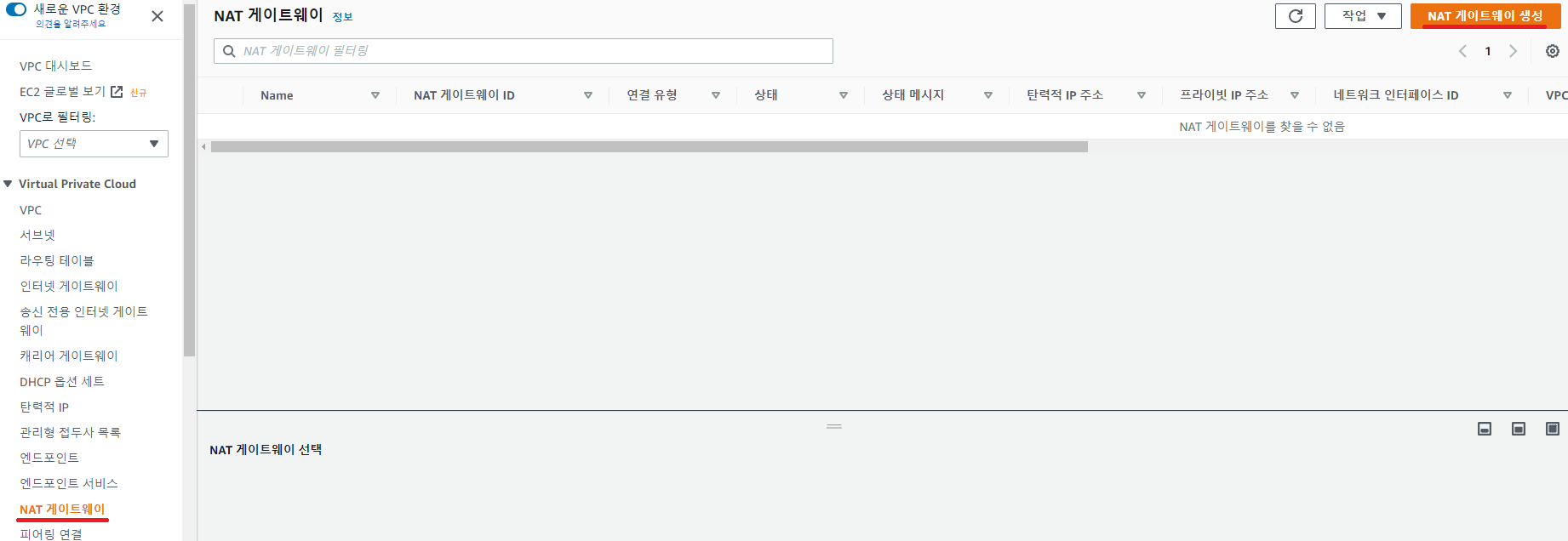 좌측 메뉴에 NAT 게이트웨이를 선택한 뒤 우측에 있는 NAT 게이트웨이 생성 버튼을 클릭해줍니다.