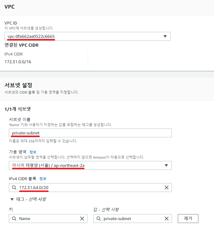 그리고 서브넷 이름, 가용 영역, CIDR 블록을 순서대로 자유롭게 작성하여 채워주시면 됩니다.