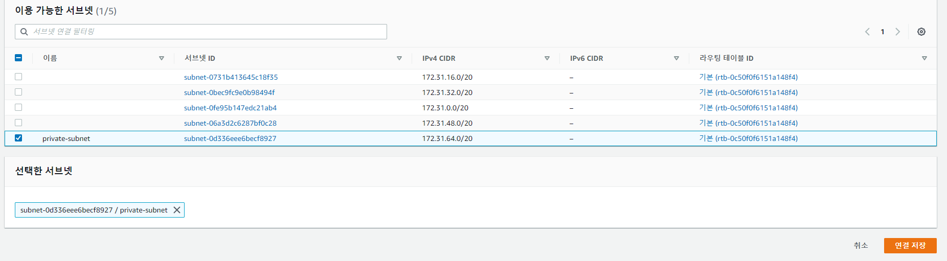위에서 만든 Private Subnet을 선택한 뒤 연결 저장을 클릭해줍니다.