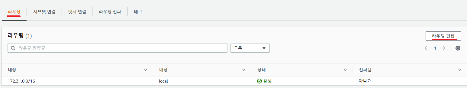 라우팅 테이블을 생성한 뒤 아래처럼 라우팅 편집 탭에서 라우팅 편집 버튼을 클릭해줍니다.
