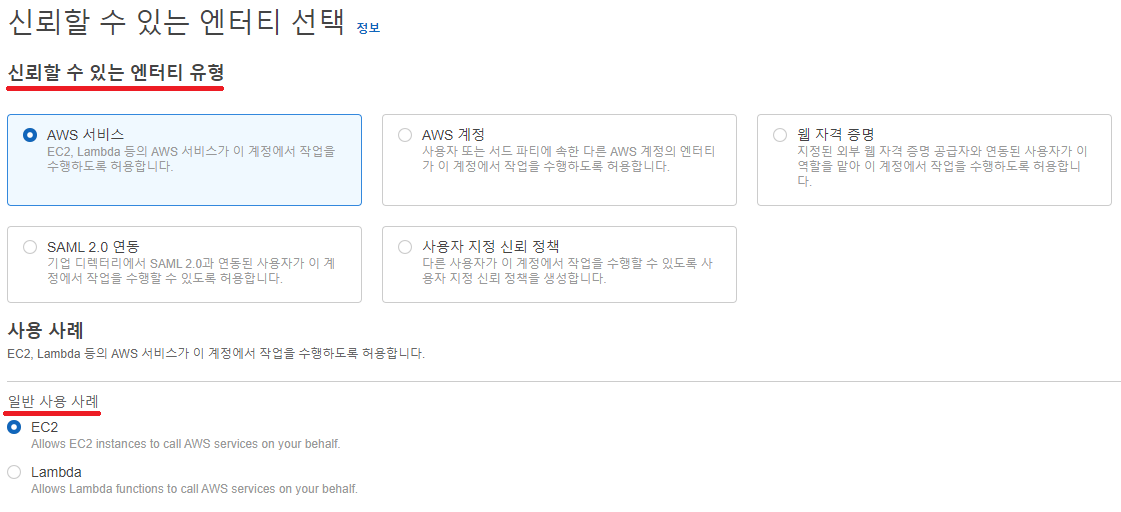 엔터티 설정에서는 엔터티 유형으로 AWS 서비스, 사용 사례는 EC2를 선택해줍니다.