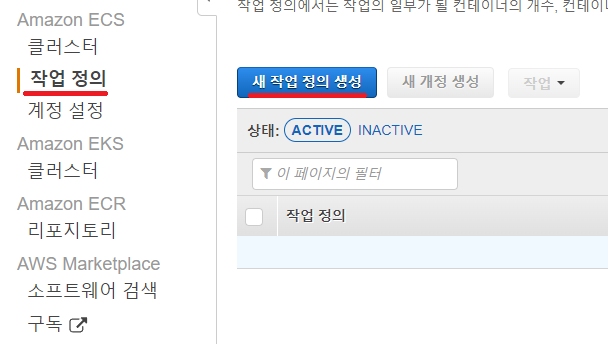 좌측 메뉴에서 작업 정의를 선택한 뒤 새 작업 정의 생성 버튼을 클릭해줍니다.