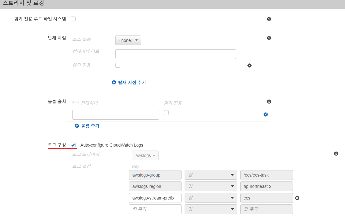 다음으로는 위에서 생성한 역할에 cloud watch logs를 위한 권한을 추가했다면 스토리지 및 로깅에서 로그 구성을 선택해줍니다.