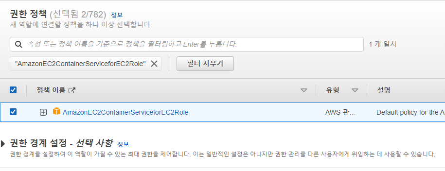 - 인스턴스 작업을 위한 AmazonEC2ContainerServiceforEC2Role (필수)