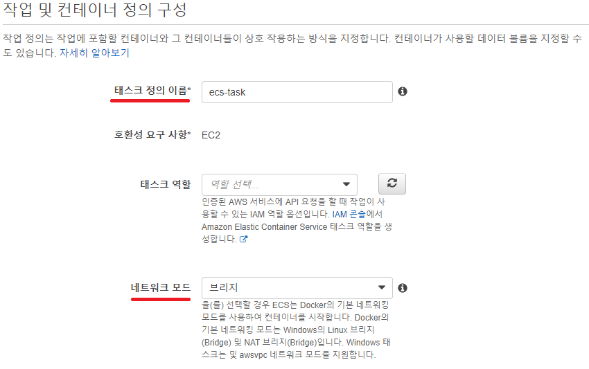 기본 설정에서는 태스트 정의 이름을 입력하고, 네트워크 모드를 브리지로 선택해줍니다.