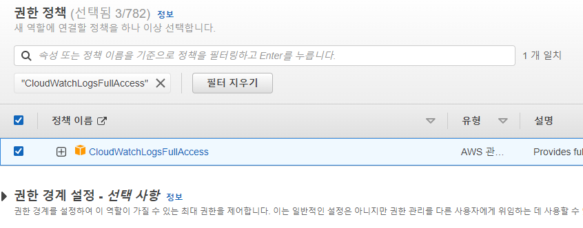- cloud watch log 기록을 위한 CloudWatchLogsFullAccess (선택)
