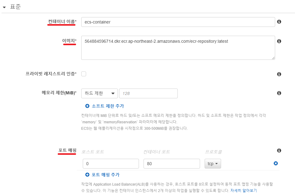 그리고 표준에서 사용할 컨테이너 이름과 도커 이미지 URI, 포트 매핑을 입력해줍니다.