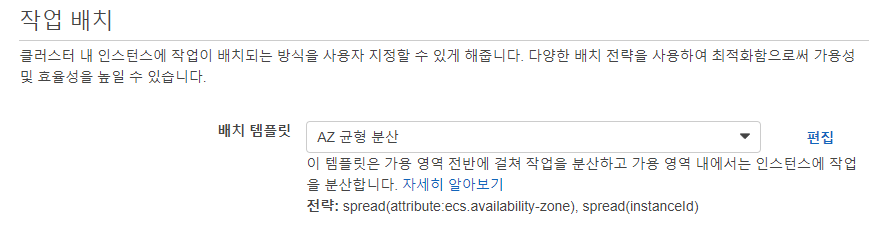 참고로 제가 선택한 AZ 균형 분산은 AZ별로 분포되어 있는 ECS EC2 인스턴스들에 균형 있게 분산하여 Docker 컨테이너가 생성될 수 있도록 도와줍니다.