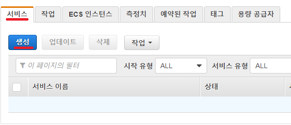 위에서 생성한 ECS Cluster를 클릭한 뒤 서비스 탭에 있는 생성 버튼을 클릭해줍니다.
