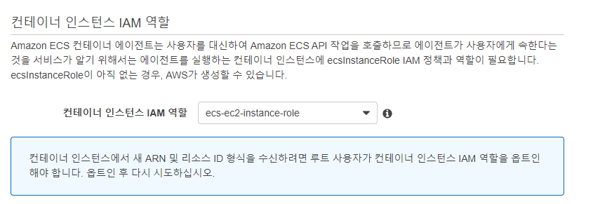 IAM 역할 설정에서는 위에서 생성한 ECS EC2 인스턴스 역할을 선택해줍니다.