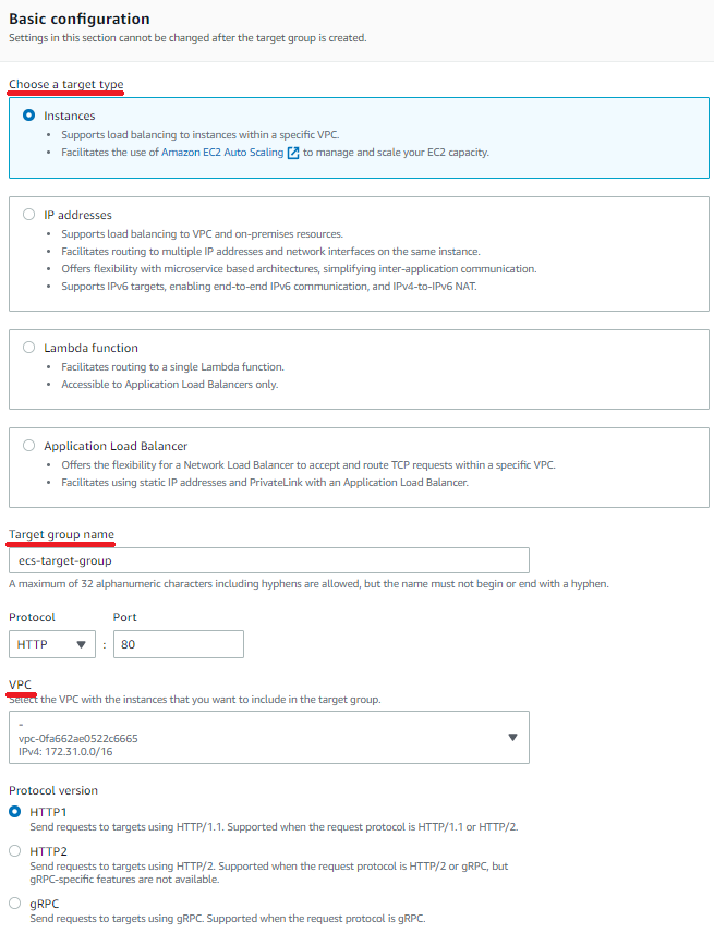 타겟 그룹의 기본 설정은 다음과 같이 유형으로는 Instances, 타겟 그룹 명 입력, 사용할 VPC를 선택해주고 프로토콜, 포트, 프로토콜 버전은 기본 값을 유지해줍니다.
