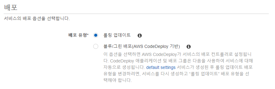 먼저 배포 유형에 있는 롤링 업데이트는 새로운 배포가 이루어질 때 기존에 Task 정의된 컨테이너들을 유지한 상태로 새로운 컨테이너들을 생성하는 배포 방식입니다.